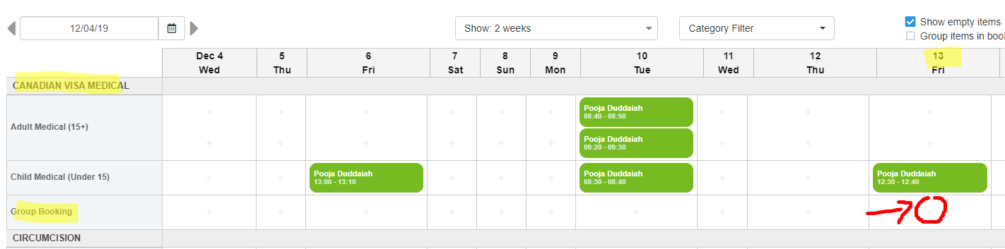 Step 2: Click the plus button on the cell of the calendar that is on the correct date and with the correct appointment type. For example, to book a Group booking for immigration on the 13th of december, you would select this cell