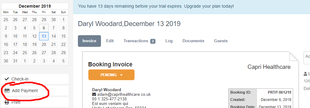 Step 7: To then take a payment for this booking, click the add payment option and enter the customer's card details