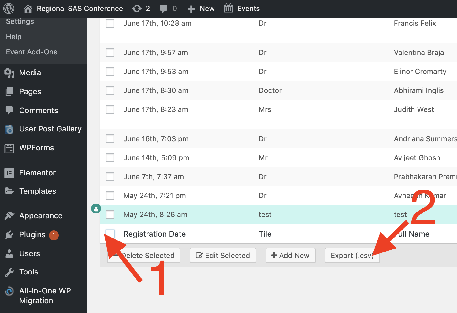 Step 6: Scroll down and check box no 1 to select all registrations or select registration individually then click on export (2).