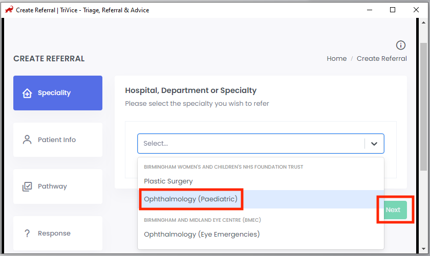 From the dropdown menu, choose the relevant specialty (e.g. Ophthalmology (Paediatric)) and click Next.