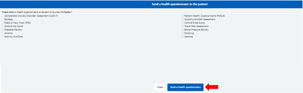 Step 2.1: Send health questionnaires to patient and click Send health questionnaires.