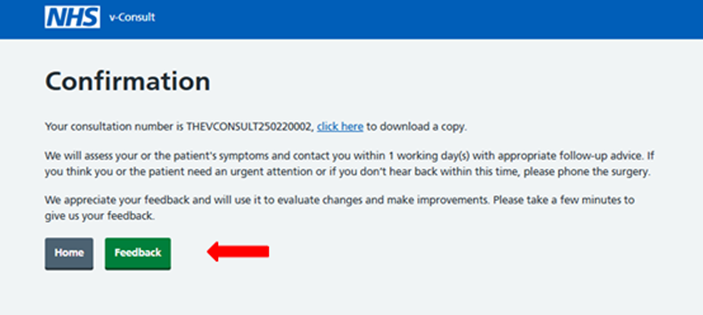 a. After submitting the online consultation request (Steps 1.1 to 1.12), you will be redirected to a confirmation screen. You can provide the feedback by clicking on Feedback. You can follow the prompts and click on submit at the end to share your feedback.